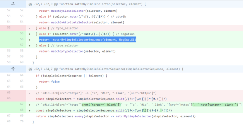 有了matchBySimpleSelectorSequence之后,实现:not伪类选择器的匹配也变成简单了,只要简单的取反就可以了