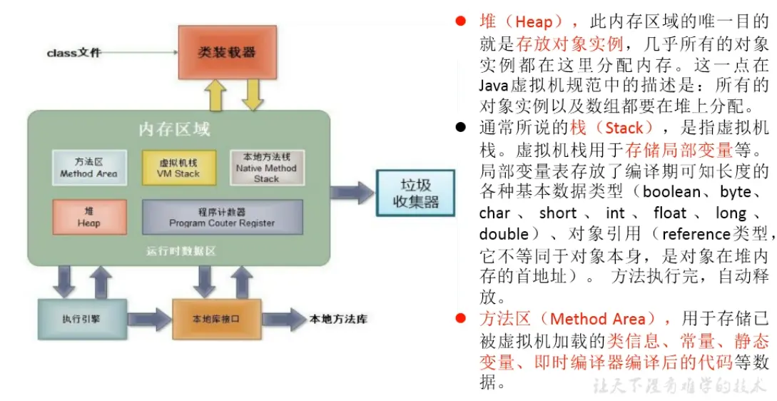 - 编译完源程序以后,生成一个或多个字节码文件;使用JVM中类的加载器和解释器对生成的字节码文件进行解释运行。意味着,需要将字节码文件对应的类加载到内存中,涉及到内存解析。