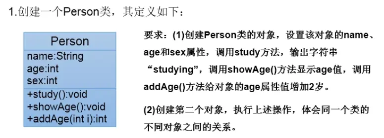 public class PersonTest { public static void main(String[] args) { Person per = new Person(); per.name = "张三"; per.age = 20; per.sex = "男"; System.out.println(per.name + "、" + per.age + "、" + per.sex); per.eat(); per.sleep(); per.speak("中文"); /* 张三、20、男 人可以吃... 人可以睡... 人可以说:中文 */ } } class Person{ String name; int age; String sex; public void eat(){ System.out.println("人可以吃..."); } public void sleep(){ System.out.println("人可以睡..."); } public void speak(String language){ System.out.println("人可以说:"+language); } }