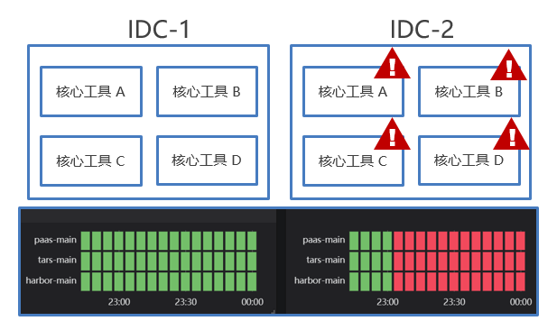 实验二:核心工具的Set化演练 目的:验证核心工具Set化能力,即当一个数据中心发生宕机故障时,监控工具、灾备工具、发布工具等核心工具在另外一个数据中心能正常提供服务。 故障场景:IDC-2内的核心工具全部宕机 结果假设:IDC-1内的监控工具、灾备工具、发布工具可提供完整服务 实验方法:飞行演练,不提前通知故障注入目标。实验时,对IDC-X内的核心工具及其依赖服务执行实例关闭。 观测方法:核心工具健康看板,如下图。