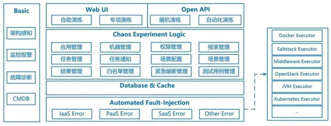 底层的故障注入层丰富了混沌实验场景,例如JVMExecutor是通过字节码增强技术对运行在JVM上的应用进行故障注入的执行器,可模拟应用调用延迟、数据库访问错误、指定方法抛出异常等SaaS层故障,Saltstack Executor可以对目标主机执行CPU满载、网络延迟、限流等故障注入。