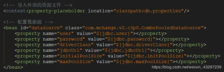 PropertyPlaceholderConfigurer的BeanFactory后置处理器, 这个处理器允许用户将 Bean 配置的部分内容外移到属性文件中. 可以在 Bean 配置文件里使用形式为${var}的变量, PropertyPlaceholderConfigurer 从属性文件里加载属性, 并使用这些属性来替换变量.