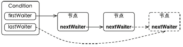 ConditionObject拥有首尾节点的引用,而新增节点只需要将原有的尾节点nextWaiter指向它,并且更新尾节点即可。上述节点引用更新的过程并没有使用CAS保证,原因在于调用await()方法的线程必定是获取了锁的线程,也就是说该过程是由锁来保证线程安全的。