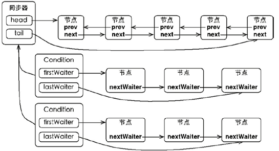 而对于并发包里面使用AQS并继承Lock接口实现的锁或者是同步组件,则拥有一个同步队列和多个等待队列。一个同步队列指的是AQS中的同步队列,多个等待队列指的是多个ConditionObject对象实例上的等待队列。AQS,同步队列以及等待队列的关系如图所示: