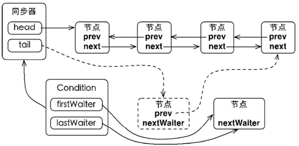 - 通过调用同步器的enq(Node node)方法,等待队列中的头节点线程安全地移动到同步队列。当节点移动到同步队列后,当前线程再使用LockSupport唤醒该节点的线程。