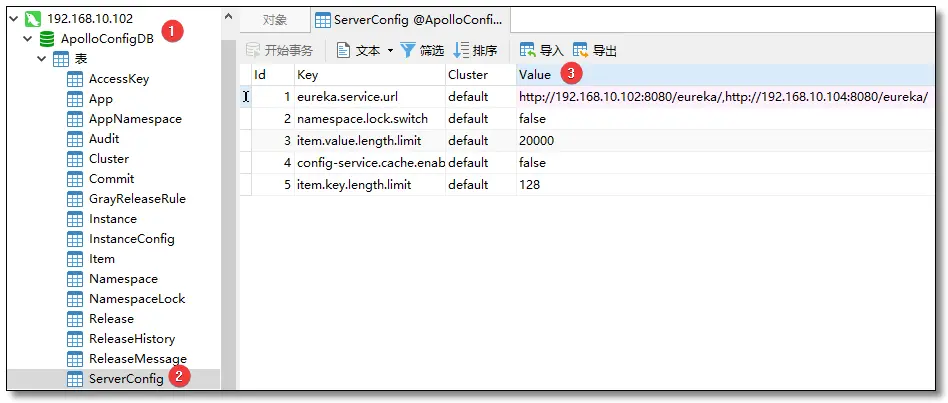 Eureka 注册中心地址存储在 ApolloConfigDB.ServerConfig 表中,如下图,在③Value的地方添加多个地址即可。