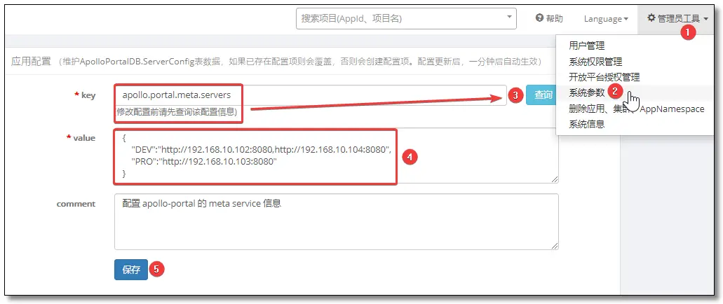 ❝对于 1.6.0 及以上版本,可以通过 ApolloPortalDB.ServerConfig 中的配置项来配置 Meta Service 地址。