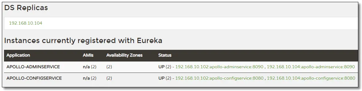 meta: http://192.168.10.102:8080,http://192.168.10.104:8080 # Apollo 中的 Eureka 注册中心地址