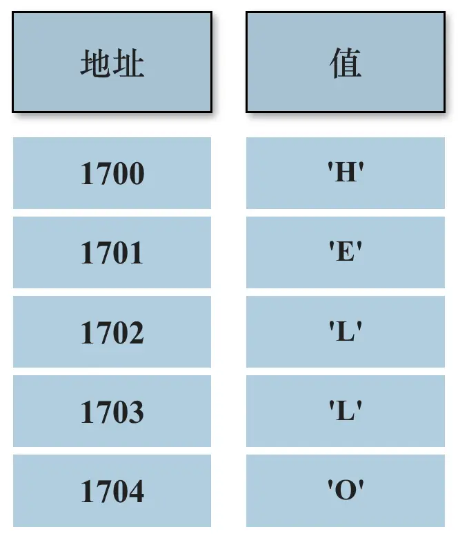 上图中,我们可以看到一个数组,拥有 5 个成员,在内存上连续存放,构成一个字符串 "HELLO"(表示“喂,你好”)。