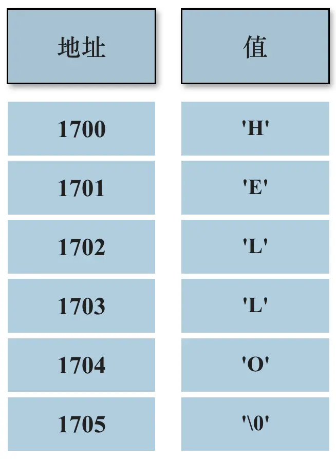 因此,下面才是正确展示我们的字符串 "HELLO" 在内存中实际存放情况的示意图: