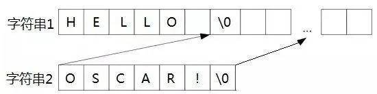 下图对于字符串在内存中是怎么存储的,可以给出一个比较直观的印象(注意: 实际的情况比这个图演示的要略微复杂一些,待会儿会解释):