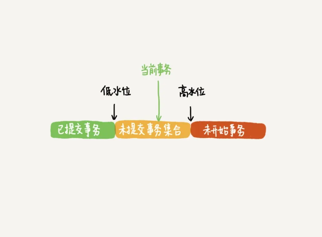数组里面事务 ID 为最小值记为低水位,当前系统里面已经创建过的事务 ID 的最大值加 1 记为高水位。