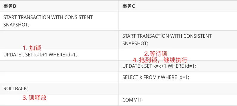 - 事务C读取到当前最新值,k=2,更新为3;