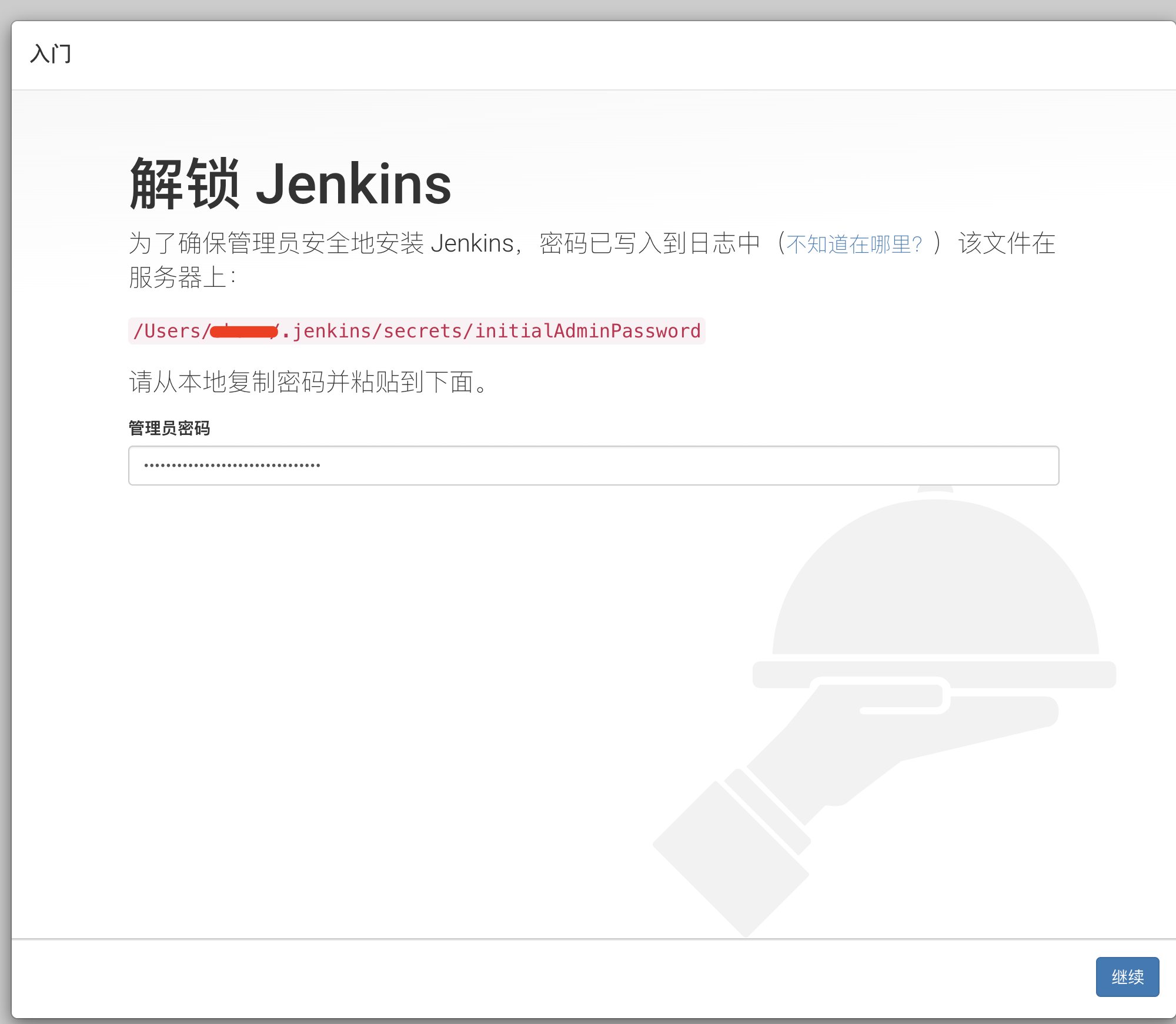 1、浏览器中输入:http://localhost:8080/jenkins/,根据图中的地址找到文件,把密码复制进去