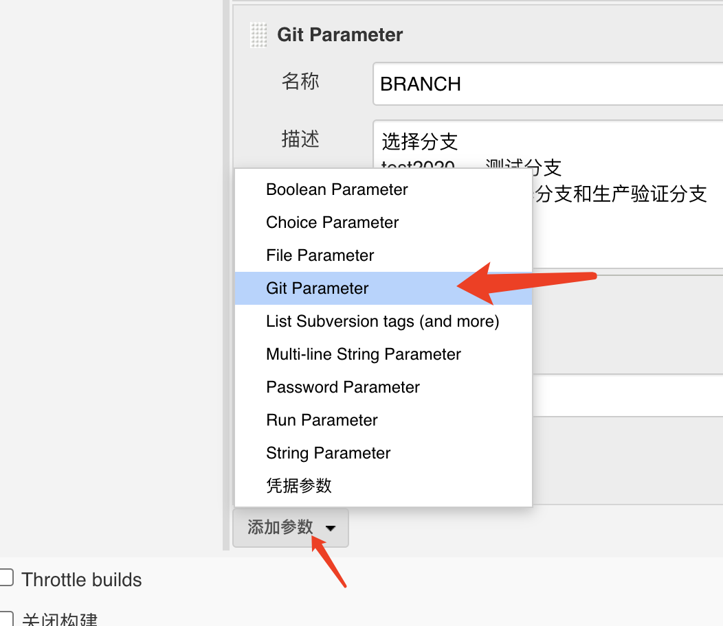 上面勾选This project is parameterized之后,可点击添加参数,进行添加选项或描述,其中( Git Parameter )需要安装插件,具体放后面讲一下