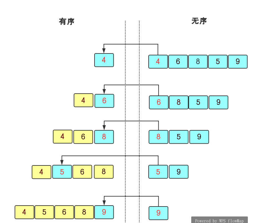 插入排序是将无序序列中的数据插入到有序的序列中,在遍历无序序列时,首先拿无序序列中的首元素去与有序序列中的每一个元素比较并插入到合适的位置,一直到无序序列中的所有元素插完为止。对于一个无序序列arr{4,6,8,5,9}来说,我们首先先确定首元素4是有序的,然后在无序序列中向右遍历,6大于4则它插入到4的后面,再继续遍历到8,8大于6则插入到6的后面,这样继续直到得到有序序列{4,5,6,8,9}