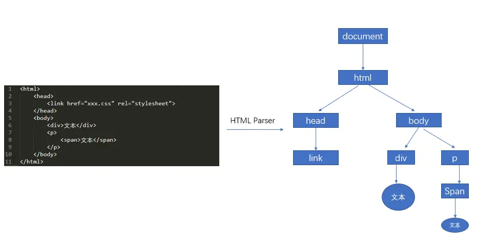 渲染进程收到 HTML 文件是无法直接被渲染引擎理解的,所以要将其转化为渲染引擎能够理解的内部结构,这个结构就是 DOM。 在渲染引擎内部,使用 HTML 解析器(HTMLParser)将 HTML 字节流转换为 DOM 结构。具体的工作流程如下: