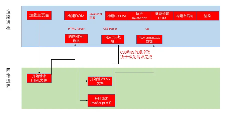 HTML 预解析器识别出来了有 CSS 文件和 JavaScript 文件需要下载,然后就同时发起这两个文件的下载请求(这两个文件的下载过程是重叠的,所以下载时间以最久的为准)。后面的流水线就和前面是一样的了,不管 CSS 文件和 JavaScript 文件谁先到达,都要先等到 CSS 文件下载完成并生成 CSSOM,然后再执行 JavaScript 脚本,最后再接着继续构建 DOM,构建布局树,绘制页面。