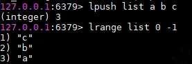 使用lpush命令往list的左侧中插入a,b,c三个字符,这边注意顺序,查询出来的是c,b,a。下面会说为什么,先挖个坑。