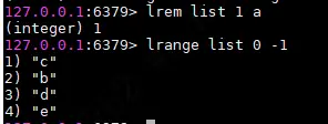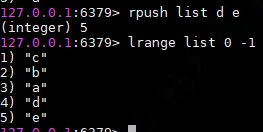 使用rpush命令往list中插入d,e两个字符,查询出来的顺序是和我们想的一样,最后两位是d,e。