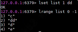 使用lset命令将mylist的下标为1的元素修改为dd,原来list为c ,b,d,e,修改后的结果为c,dd,d,e。