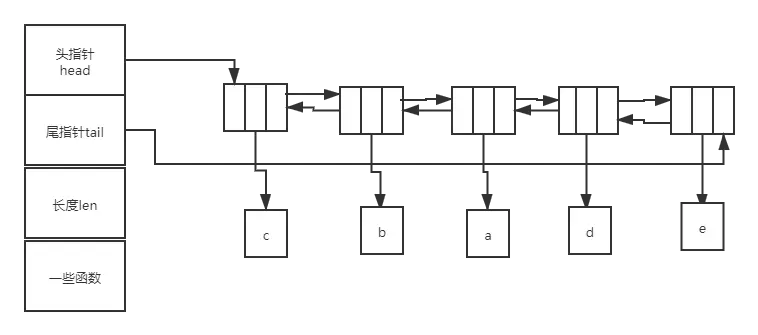 包括头指针head,尾指针tail,整个链表长度len,一些函数(个人认为不重要,如果有知道的小伙伴欢迎评论),如下图所示。头指针head指向整个链表的第一个节点,尾指针tail指向整个链表的最后一个节点。