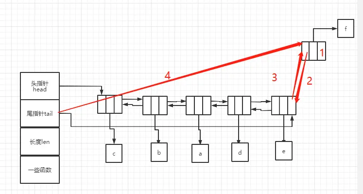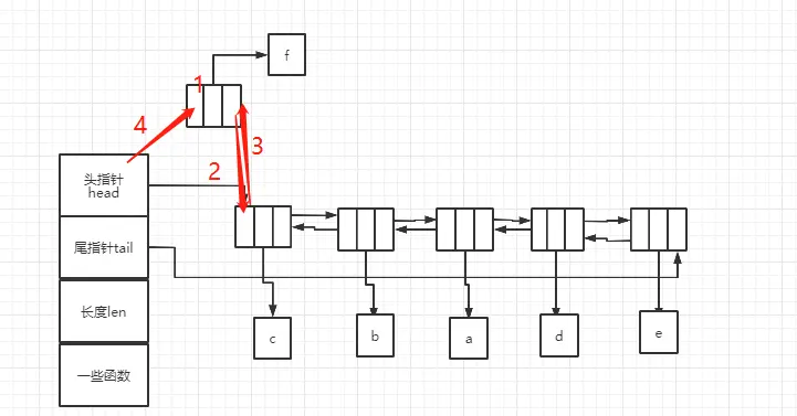举个例子,如果要在list中插入节点f,首先将节点的头指针赋值为空(对应步骤1),然后将新节点的尾指针next指向第一个节点(对应步骤2),将第一个节点的prev指向新节点(对应步骤3),最后将list的头指针head指向新节点(对应步骤4)。这边需要注意的是,步骤2和步骤3需要在步骤4前面,不然会找到第一个节点。