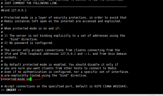 然后继续往下10来行看到protected-mode yes,我们把yes改成no,按esc键退出编辑模式,输入: :wq 命令保存并退出