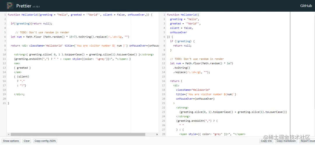 Prettier 是一种代码格式化程序,支持 JavaScript,包括 ES2017、JSX、Angular、Vue、Flow 和 TypeScript 等。它会用符合标准并遵循最佳实践的样式替换掉你原来的样式。这个方便的工具在我们的 IDE 中非常流行,但是它也有自己的在线版本,你可以在里面优化你的代码。