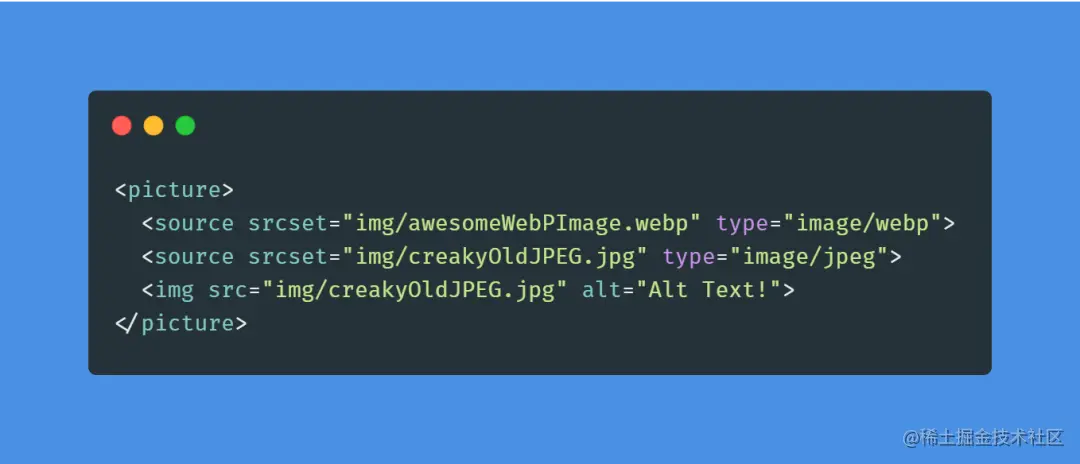 如你所见,目前 Safari 和 IE 不支持。这意味着你应该为不兼容的浏览器提供一个后备选项。下面的代码段是支持所有浏览器的最常用 WebP 图像实现。