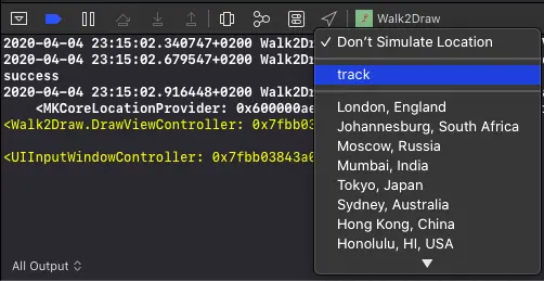 将gpx文件添加到项目中,然后在模拟器上运行您的应用。在Xcode的调试栏中,单击位置图标,然后选择添加到项目中的文件。在此示例中,我将文件命名为track.gpx。