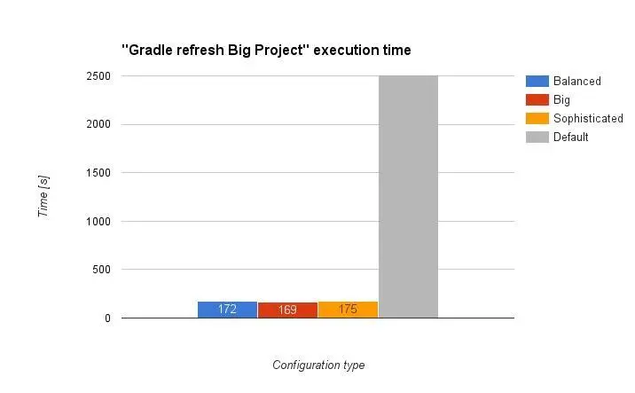 重要提示:代表默认设置的灰色条形柱非常高,因为 IDEA 在刷新过程中崩溃了,笔者无法测量实际时间。显然,默认分配的内存不足以执行该操作。