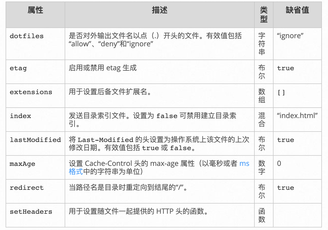 其中rootDir是提供静态资源的根目录,options是可选的对象,可以具有以下属性: