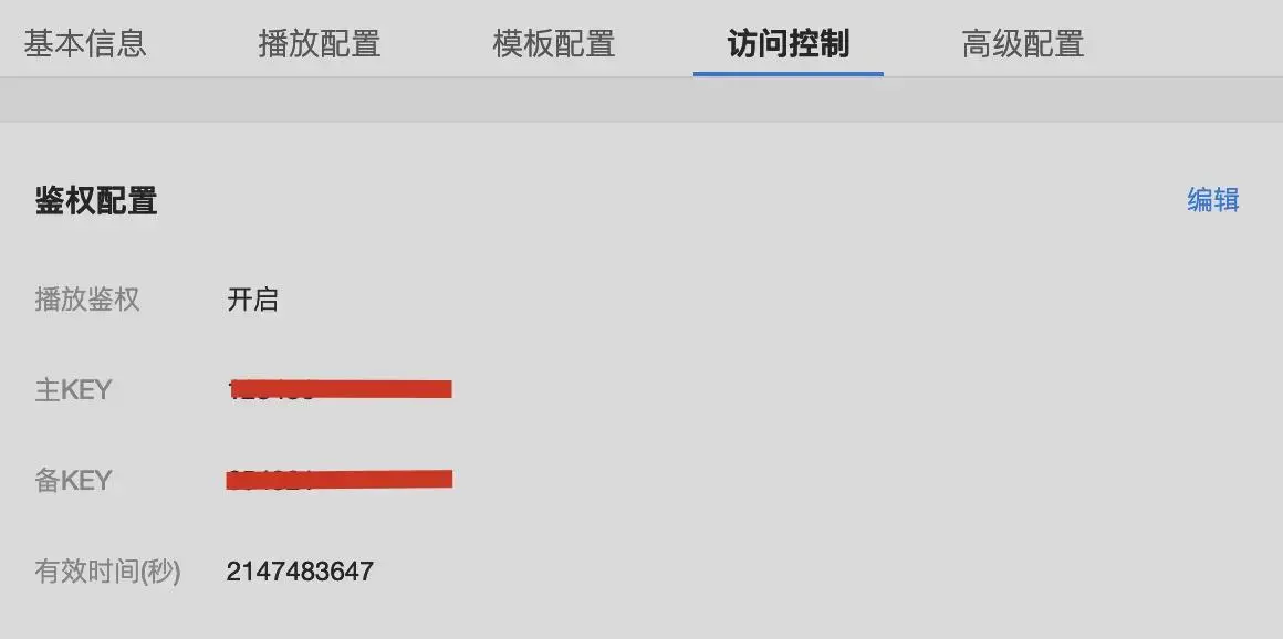 「云直播控制台」-「域名管理」-「在要开启权鉴播放域名上,点击管理」-「访问控制」-「编辑」-「开启权鉴」-「设置主key、备key、过期时间」
