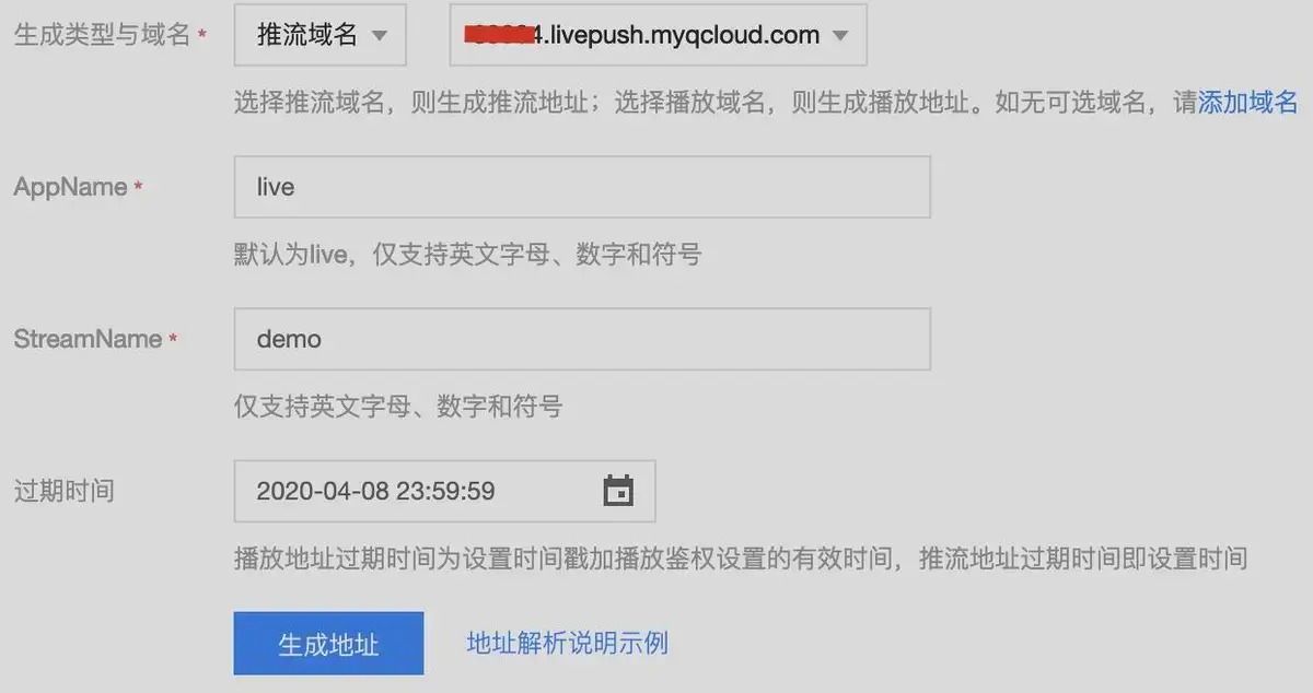 点击「生成地址」,控制台自动生成好推流和拉流地址和权鉴,如下: