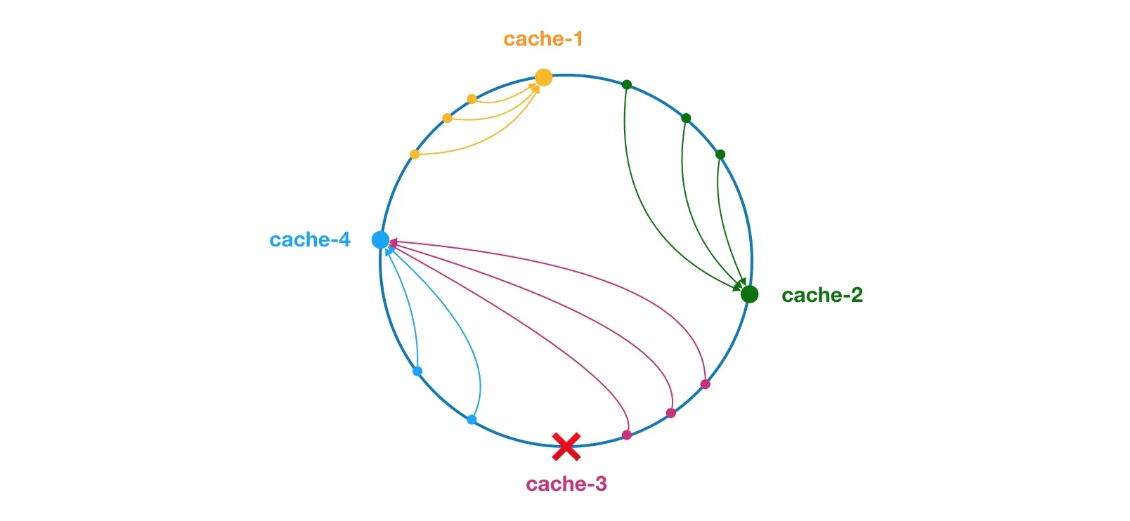 比如下面绿色点对应的缓存项将会被存储到 cache-2 节点中。