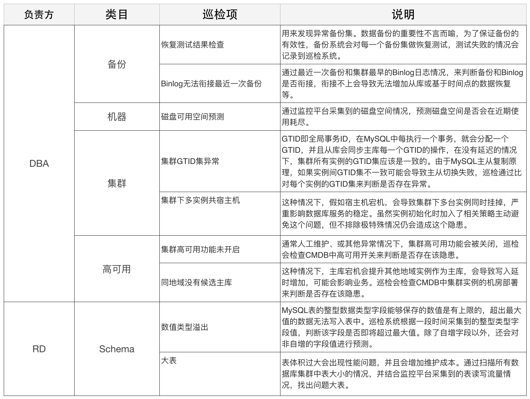 集群:主要检查集群拓扑、核心参数等集群层面的隐患; 机器:主要检查服务器硬件层面的隐患; Schema/SQL:检查表结构设计、数据库使用、SQL质量等方面的隐患; 高可用/备份/中间件/报警:主要检查相关核心功能组件是否存在隐患。