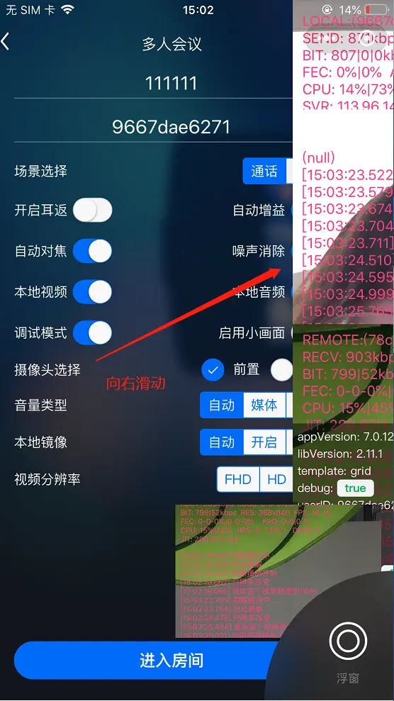 向右滑动时可以看到小窗,远端画面显示决定小窗横竖屏