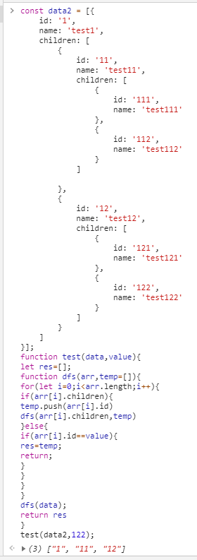 const data2 = [{ id: '1', name: 'test1', children: [ { id: '11', name: 'test11', children: [ { id: '111', name: 'test111' }, { id: '112', name: 'test112' } ] }, { id: '12', name: 'test12', children: [ { id: '121', name: 'test121' }, { id: '122', name: 'test122' } ] } ]}];