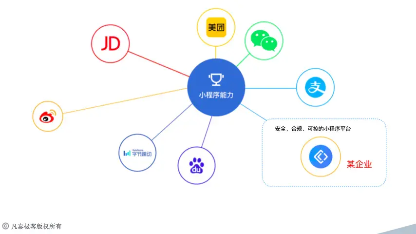 不过,随着市场对小程序需求量的增大,方案一明显不能满足所有企业,也无法解决所有的数字化问题。面对这样迫切的市场需求,凡泰极客率先推出了创新性的凡泰小程序开放平台,为所有企业提供私有化小程序运行时的技术方案。即,提供了将小程序运行时集成到APP以及小程序上下架管理后台的一站式服务,小程序将不再是互联网巨头的专利。