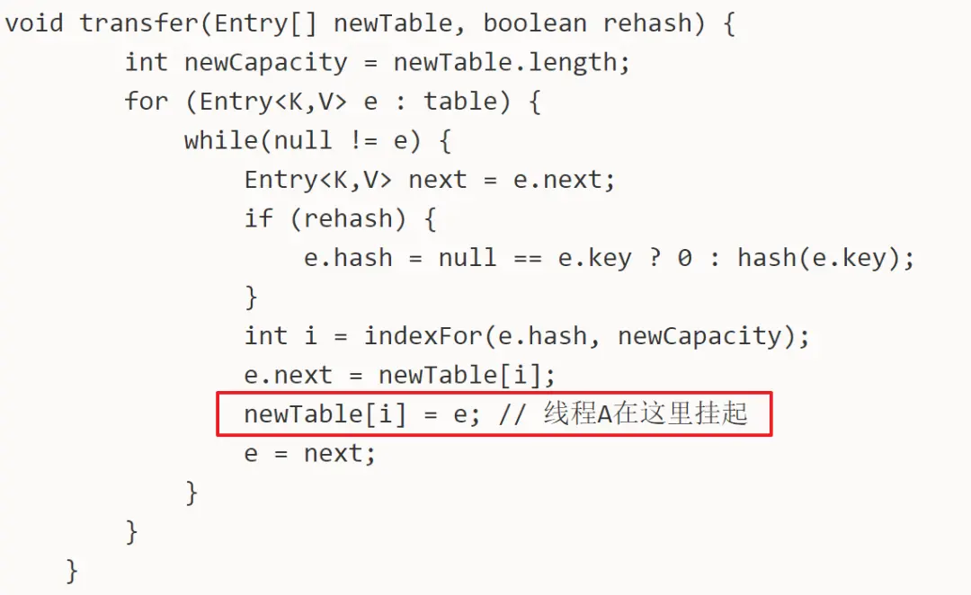 然后在多线程环境下,假设有两个线程A和B都在进行put操作。线程A在执行到transfer函数中第11行代码处挂起,因为该函数在这里分析的地位非常重要,因此再次贴出来。