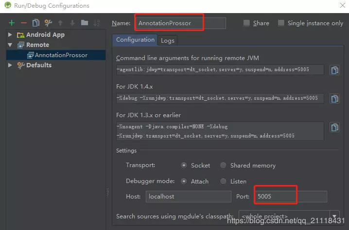并在Edit Configurations中新添加一个远程配置(remote),名字随意,端口为5005。 然后点击debug按钮,就可以连接上远程调试器进行Annotation的调试了。
