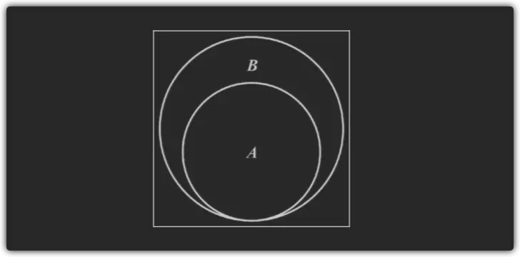 子集(A⊆B),给定了两个集合,判断其中一个集合中的元素是否都存在于另一个集合中,如果又一个不存在则返回false,该集合定义如下:集合A中的每一个X(元素),也需要存在于集合B中。