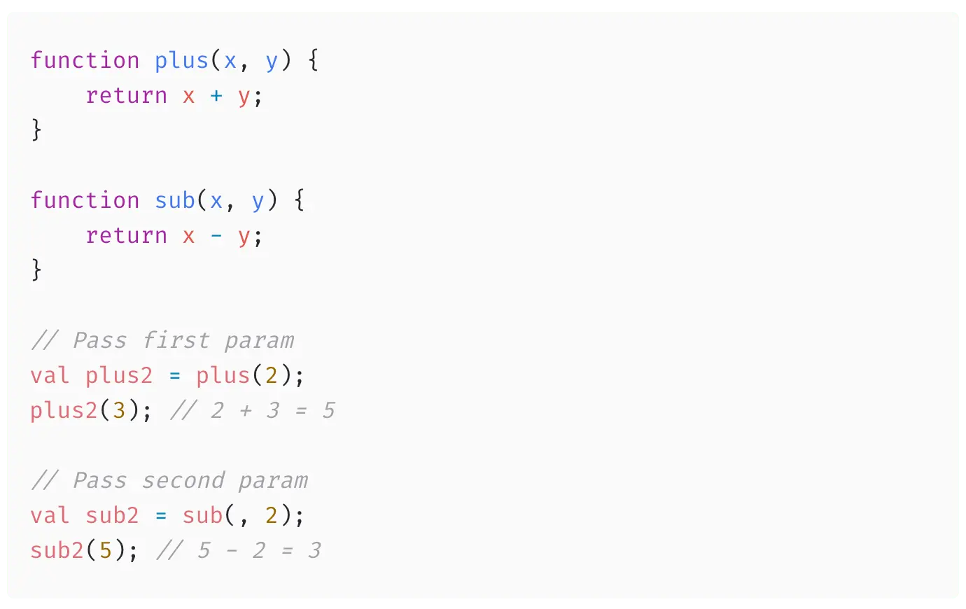 在 JavaScript 中,我们要对一个函数进行 partial apply,那么要求这个函数必须先经过 curry,比如下面这样: