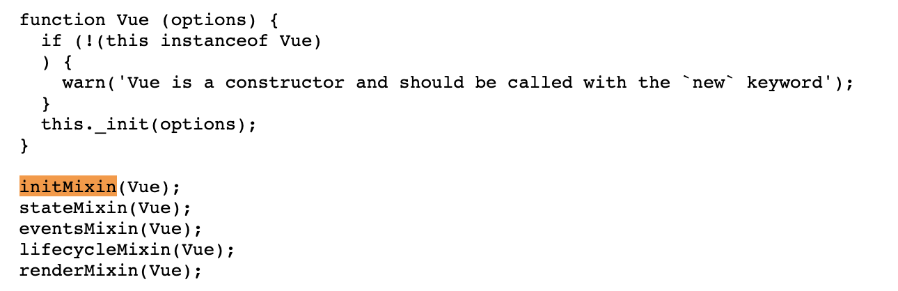 其中定义了Vue构造函数,然后分别调用initMiXin,stateMixin,eventsMixin,lifecycleMixin,renderMixin,并将Vue构造函数当作参数传给这5个函数