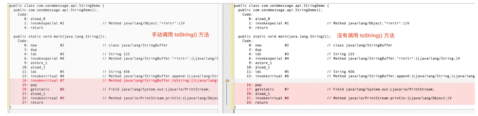 上图左边是手动调用 toString 方法的代码,右图是没有调用 toString 方法的代码,可以看到,toString() 方法不像 + 一样自动被调用。