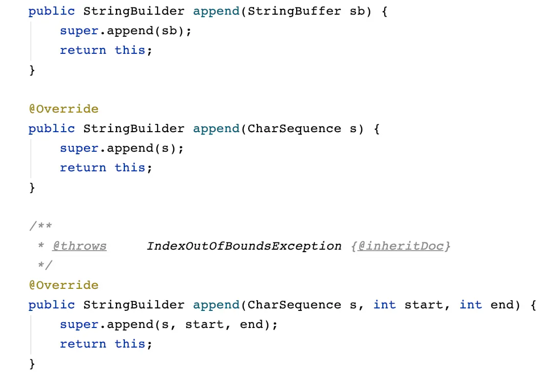 StringBuilder 被 final 修饰,表示 StringBuilder 是不可被继承的,StringBuilder 类继承于 AbstractStringBuilder类。实际上,AbstractStringBuilder 类具体实现了可变字符序列的一系列操作,比如:append()、insert()、delete()、replace()、charAt() 方法等。