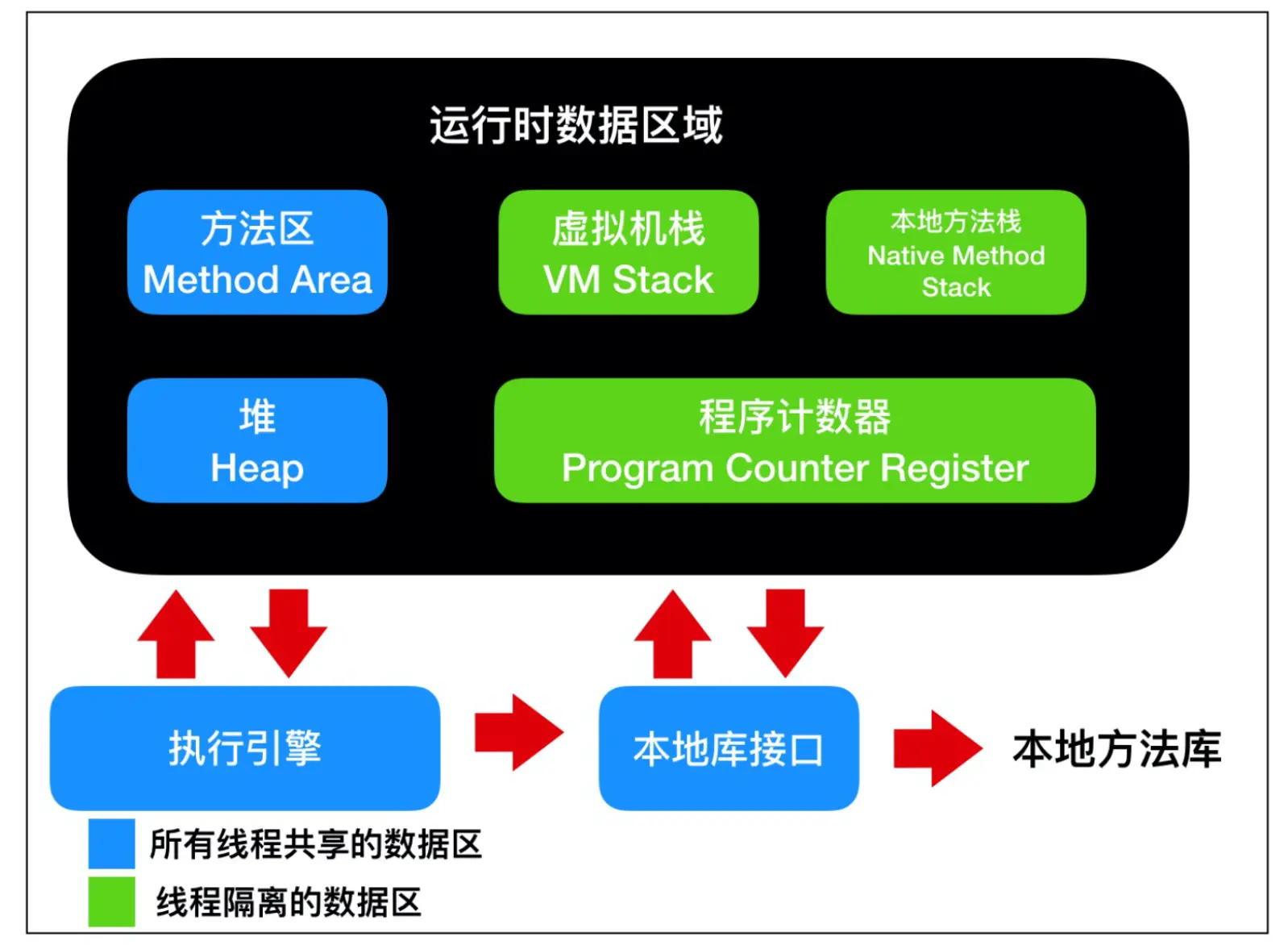 虚拟机栈: Java 虚拟机栈是线程私有的数据区,Java 虚拟机栈的生命周期与线程相同,虚拟机栈也是局部变量的存储位置。方法在执行过程中,会在虚拟机栈种创建一个栈帧(stack frame)。本地方法栈: 本地方法栈也是线程私有的数据区,本地方法栈存储的区域主要是 Java 中使用native关键字修饰的方法所存储的区域程序计数器:程序计数器也是线程私有的数据区,这部分区域用于存储线程的指令地址,用于判断线程的分支、循环、跳转、异常、线程切换和恢复等功能,这些都通过程序计数器来完成。方法区:方法区是各个线程共享的内存区域,它用于存储虚拟机加载的 类信息、常量、静态变量、即时编译器编译后的代码等数据。堆: 堆是线程共享的数据区,堆是 JVM 中最大的一块存储区域,所有的对象实例都会分配在堆上运行时常量池:运行时常量池又被称为Runtime Constant Pool,这块区域是方法区的一部分,它的名字非常有意思,它并不要求常量一定只有在编译期才能产生,也就是并非编译期间将常量放在常量池中,运行期间也可以将新的常量放入常量池中,String 的 intern 方法就是一个典型的例子。