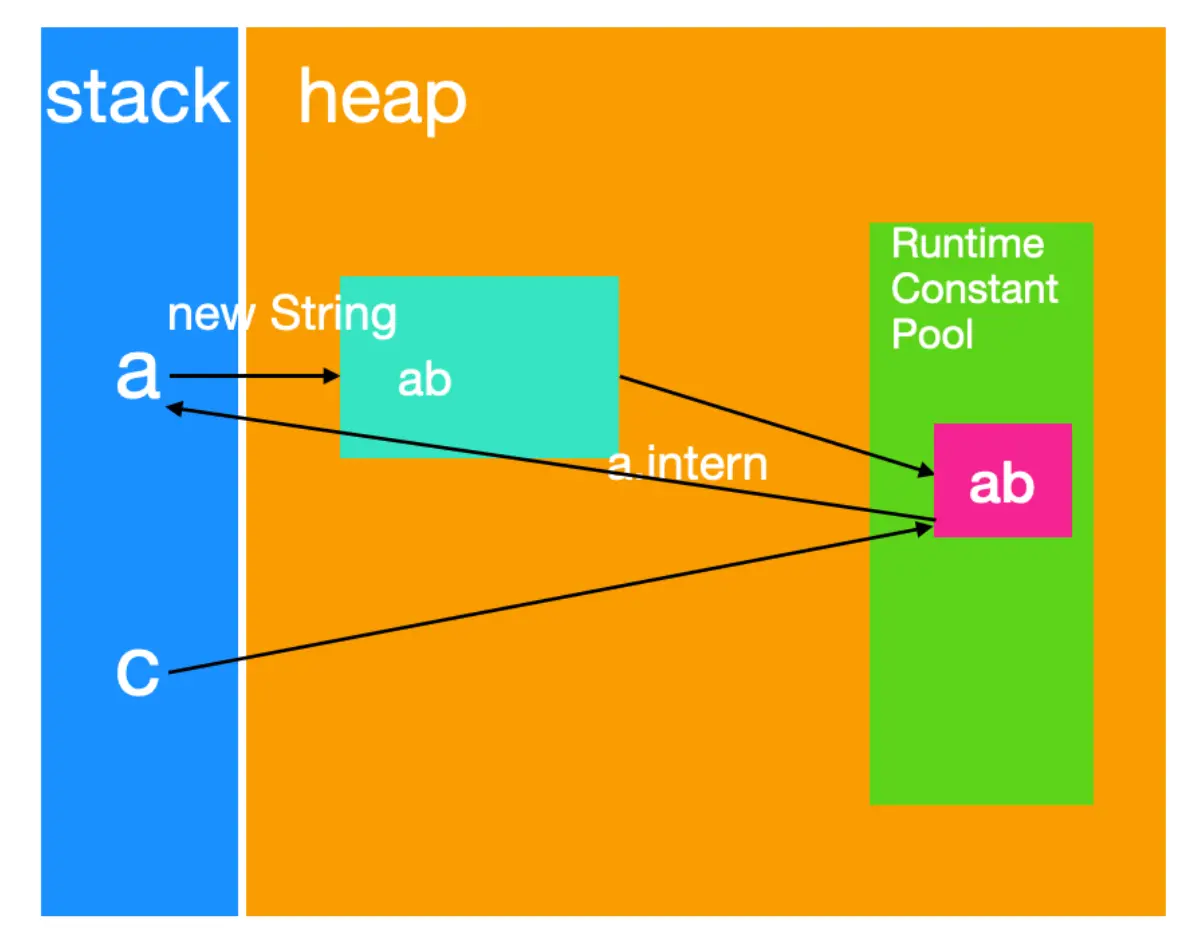 a.intern 返回的是常量池中的 ab,而 b 是直接返回的是堆中的 ab。地址不一样,肯定输出 false