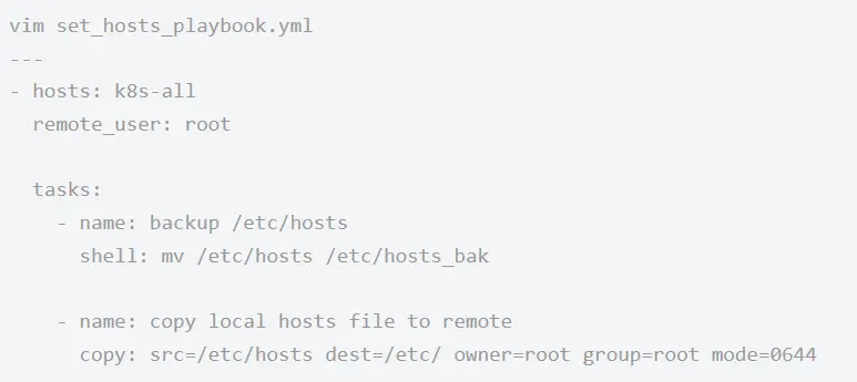 修改所有主机/etc/hosts文件,添加IP/主机名映射,方便通过主机名ssh访问 1.创建playbook文件(参考 set_hosts_playbook.yml)